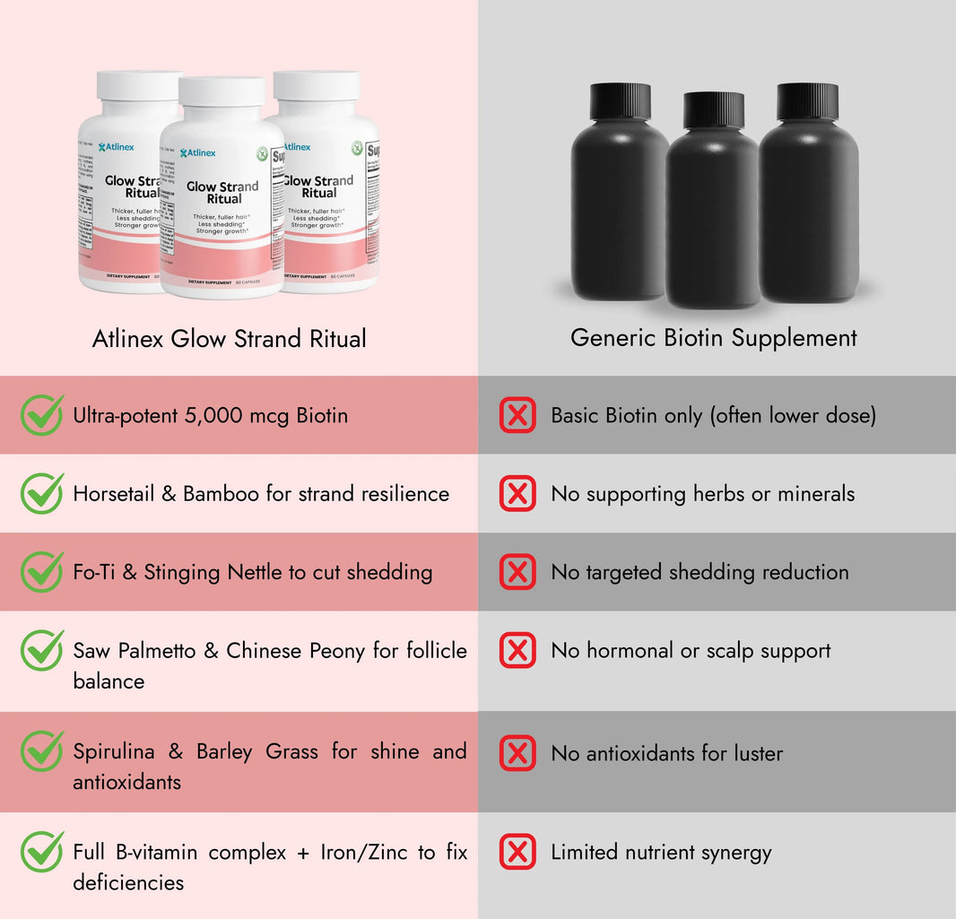 Great question! Regular biotin is good, but Glow Strand Ritual is so much more. You get an ultra-high potency 5,000 mcg of biotin plus our exclusive proprietary hair blend. They all work together to reduce shedding, boost thickness, and support stronger growth. It's complete, targeted hair nourishment. Not just one ingredient. That's why women see better, faster results!