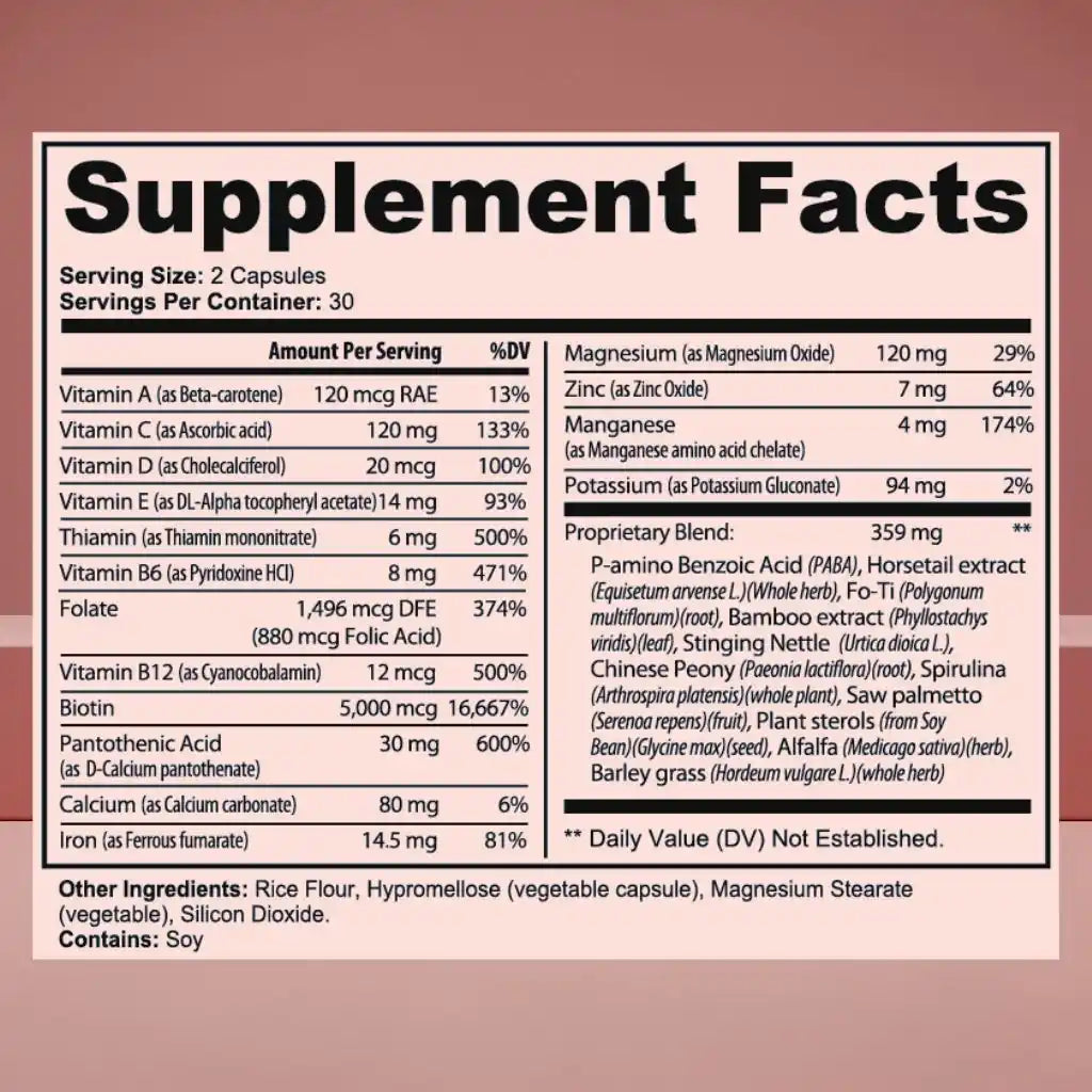 Ingredients: Vitamin A (as Beta-carotene), Vitamin C (as Ascorbic Acid), Vitamin D (as Cholecalciferol), Vitamin E (as DL-Alpha tocopheryl acetate), Thiamine (B1)(as Thiamine mononitrate), Vitamin B6 (as Pyridoxine HCL), Folate, Vitamin B12 (as Cyanocobalamin), Biotin, Pantothenic Acid (B5)(as D-Calcium pantothenate), Calcium (as Calcium Carbonate), Iron (as Ferrous fumarate), Magnesium (as Magnesium Oxide), Zinc (as Zinc Oxide), Manganese (as Manganese amino acid chelate), Potassium (as Potassium gluconate), Proprietary Blend (PABA, Horsetail extract, Fo-Ti, Bamboo extract, Stinging Nettle, Chinese Peony, Spirulina, Saw palmetto, Plant sterols, Alfalfa, Barley grass), Hypromellose (vegetable capsule), Rice Flour, Magnesium Stearate, Silicon dioxide.