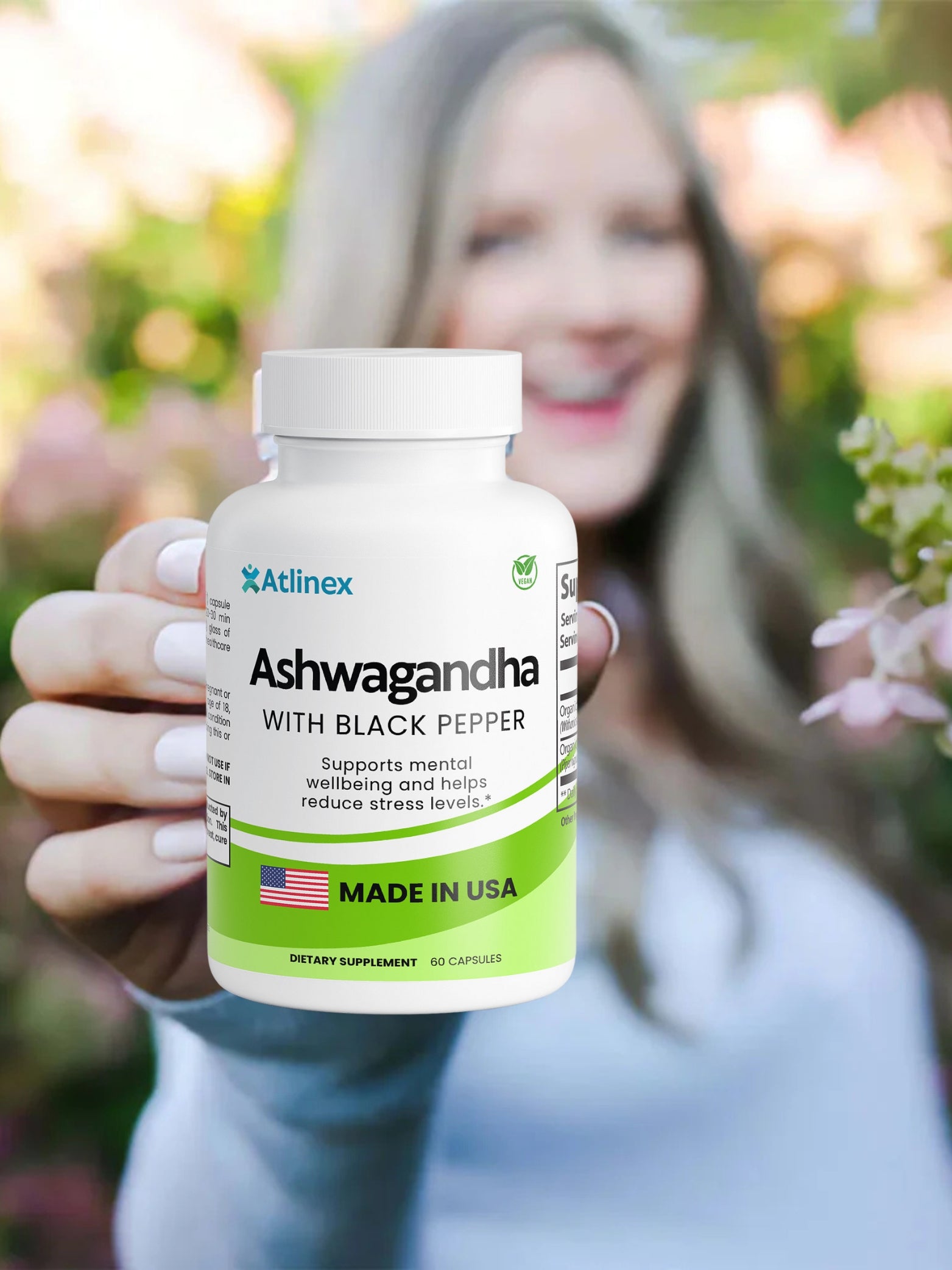 Each serving contains 1950 mg of Organic Ashwagandha Root Powder and 15 mg of Organic Black Pepper. The capsules themselves are vegetarian.